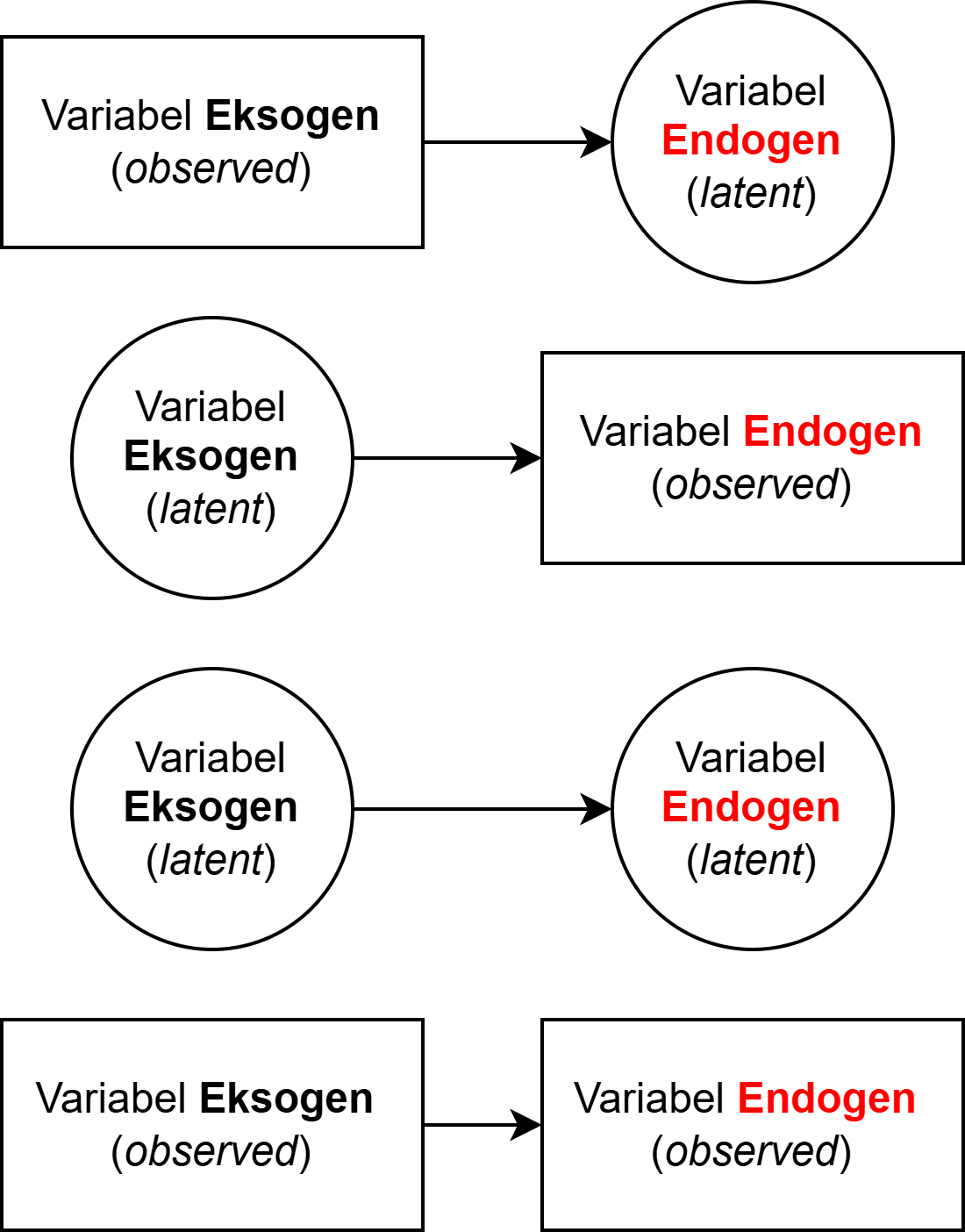 Model SEM mengasumsikan (hipotesis) bahwa seperangkat variabel (observed) mendefinisikan sebuah konstruk laten, dan menggambarkan bagaimana hubungan antara konstruk-konstruk laten ini.