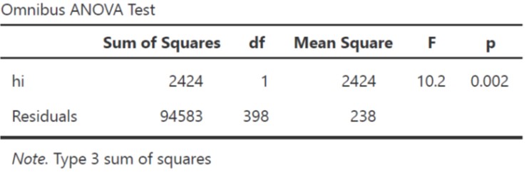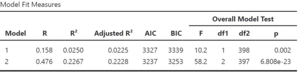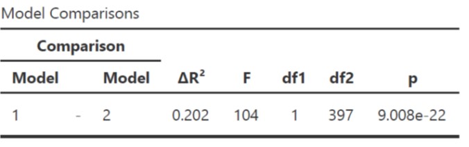 Ketika dibandingkan, Model 1 dan Model 2 berbeda signifikan (F(1,397)=104, p<.001). Δ_R_2=.202, artinya selisih R2 Model 1 dan Model 2=.202 atau R2 naik sebesar 20.2%