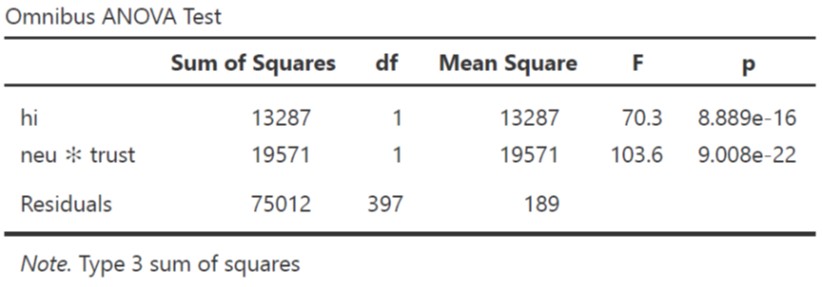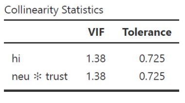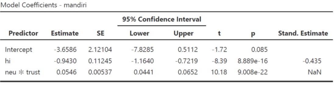 - Model 2 prediktornya hi dan interaksi antara neu dengan trust