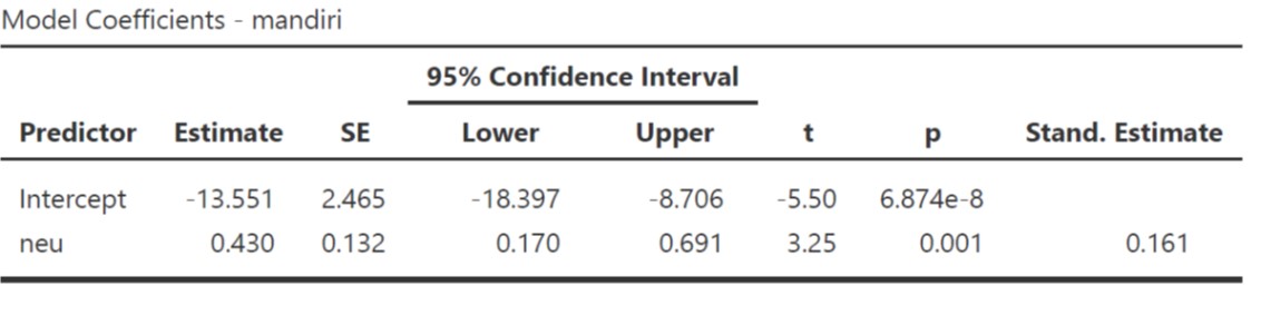 - Unstandardized (B) estimates: Setiap perubahan neuroticism sebesar 1 poin, maka tingkat kemandirian juga berubah sebesar 0.43 poin.