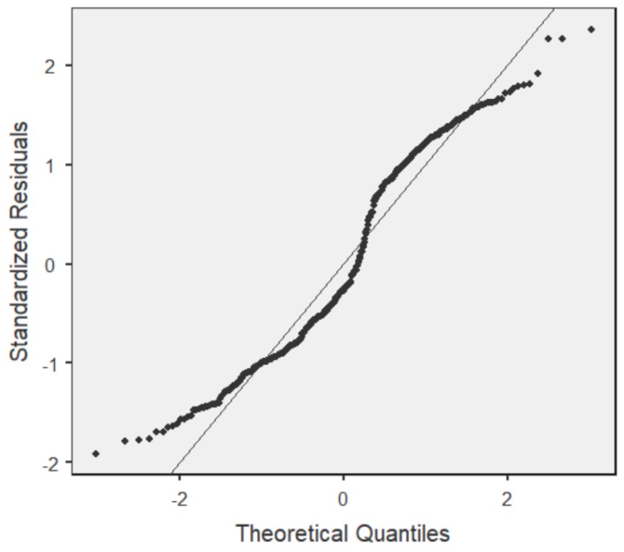 - Apabila residual tersebar secara acak atau makin menjauhi garis diagonal, berarti tidak berdistribusi normal dan ini melanggar asumsi ordinary least square.
