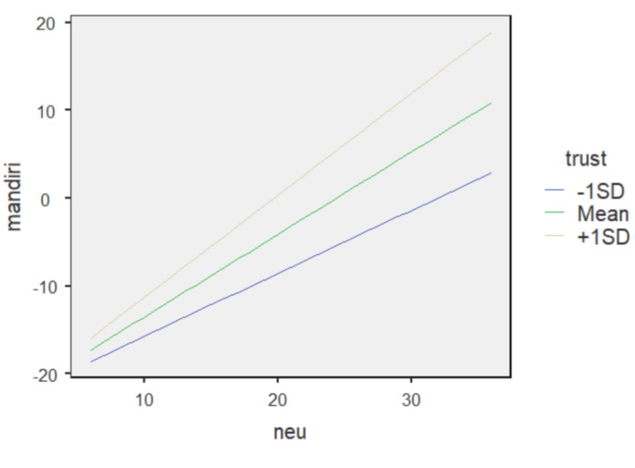 - Unstandardized B yang positif artinya, pada ibu dengan trust yang tinggi, korelasi antara kecenderungan neuroticism dengan kemandirian anak juga semakin positif/menguat.