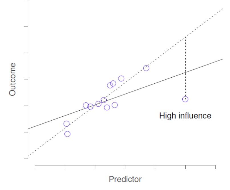 - Artinya outlier tersebut tidak terlalu mengganggu garis regresi.